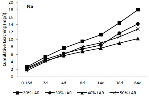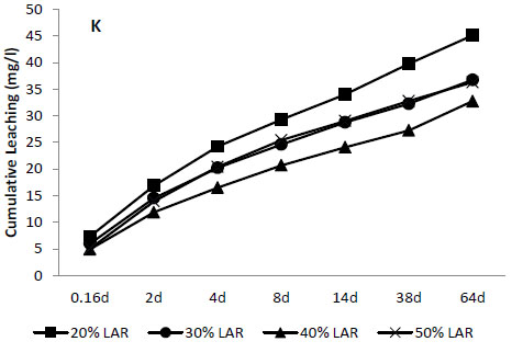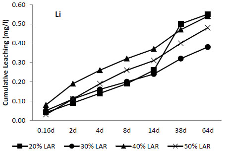 Figs. (11-13) show the cumulative leaching of Na, K and Li, respectively, from the MCU produced. The cumulative concentration of Na is well below the concentration limit permitted (200 mg/l), which indicates that the leaching of this element does not represent a risk if contamination of soil and underground water. Even if the cumulative concentration of K (Fig 12) is transformed into sodium equivalent (i.e., Naeq = Na + 0.658 × K) and added to the cumulative concentration of Na in Fig. (11), the cumulative leaching of Na would be below 200 mg/l. The cumulative leaching to Li is below 2.5 mg/l in all cases. However, the cumulative leaching of this element is generally higher for MCU’s with higher LAR content. On the contrary, the leaching of Na and K appear to be higher when the PC content is higher in the mixes, which can be observed for CMU with 20% LAR (80% PC).