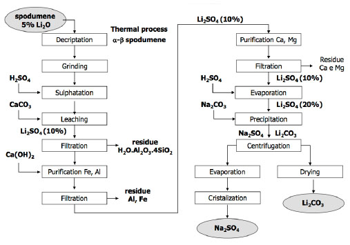 Lithium is used for many industrial applications, e.g. ceramics and glasses, mobile phone, automotive batteries and medicine. Lithium is found in nature in granitic pegmatites or brines. Pegmatites deposits occur worldwide containing about 0.01 to 0.85 million tons of Li; the global resource is 3.9 million tons of Li [1]. Economic concentrations occur in highly fractionated and zoned intrusions, the most notable of which in Australia, Canada, Zimbabwe and Zaire [2]. Brine deposits occur mainly in Chile, Argentina and USA. An ample geological data is available in the literature [1, 3, 4]. The most abundant of lithium minerals is spodumene (LiAlSi2O6), a lithium pyroxene containing up to 3.73% Li (8.03% Li2O). Spodumene undergoes a series of mineral processing to produce commercial LiCO3 and LiOH.