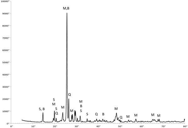 XRD difractogram of LAR (PSD < 75 µm). S = spodumene; M = marialite, Q = quartz, B = bassanite.