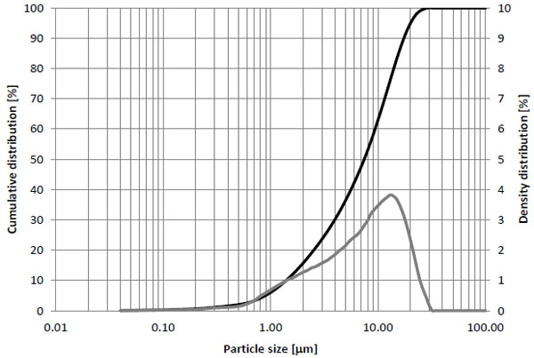 Manual sieving has determined the fraction of the LAR retained in a 0.15 mm sieve, between 0.075 - 0.15 mm and passing 0.075 mm. The vast majority of LAR (75.3%) has particle size below 75 microns, which is desirable to replace the PC in concrete formulations. Yet 17.5% of the material has particle size between 0.075 - 0.15 mm and 7.2% are coarser than 0.15mm; both fractions may act as a fine aggregate rather than a reactive material. Five samples of LAR with particle size below 75 μm were submitted to Laser PSD. The equipment does not detect coarser particles of LAR (in the range of mm). Fig. (5) shows the particle size distribution and cumulative distribution for one sample, as the others have nearly identical PSD curve. Overall, the mean particle size ranged from 11.91 to 13.58 μm. Results also have shown that 100% of the particles submitted to Laser PSD (i.e. diameter < 75 μm) have particle size below 30 μm. This fine fraction of LAR may demand more mixing water to maintain the same workability.
