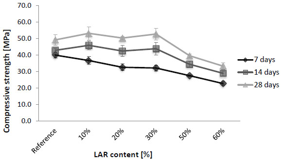 Compressive strength or mortars was carried out to give an indirect assessment of the pozzolanic activity of LAR. Fig. (6) shows the curves for 7, 14 and 28 days compressive strength for mortars containing up to 60% LAR (% wt). Each point on the graph is the average of 4 specimens, and the error bars correspond to the standard deviation. It can be observed that the compressive strength increased with age for all mortars, which is more prominent for those with 10-30% LAR. In fact, the increase of strength for the reference formulation (0% LAR) was not expected, as the rapid-hardening PC achieves most of its strength between 7-14 days. On the other hand, mortars with 50-60% LAR may not contain sufficient amount of PC (and, consequently, portlandite) to promote pozzolanic reaction. Overall, Fig. (6) shows that the compressive strength of mortars did not change much at 14 and 28 days for a replacement of 30% wt. PC or less. Further additions of LAR may reduce the strength of mortars or concretes even at prolonged age.