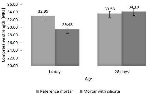 The effect of the LAR addition in the fresh properties of construction materials is evident with the results of the consistency index for mortars. This test measures the diameter of the mortar after it has been spread by the operation of the flow table (30 strokes). Table 4 shows that the replacement by weight of cement with LAR decreases the consistency of the concrete mixture. It can be observed that the reference mortar (without silicate) has a consistency index of 175 mm, which is reduced to 100 mm when 60% of LAR replaces PC. The reduction in the consistency index may be a problem in developing conventional concretes and mortars, which will demand more mixing water or at least more admixtures. However, this should not be an issue when drier mixtures are used, such as the production of pre-fabricated elements.