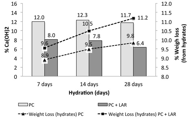 Evolution of Ca(OH)2 content and estimated weight loss from calcium silicate hydrate, calcium aluminates and ettringite in the reference paste (PC) and paste containing PC+LAR.