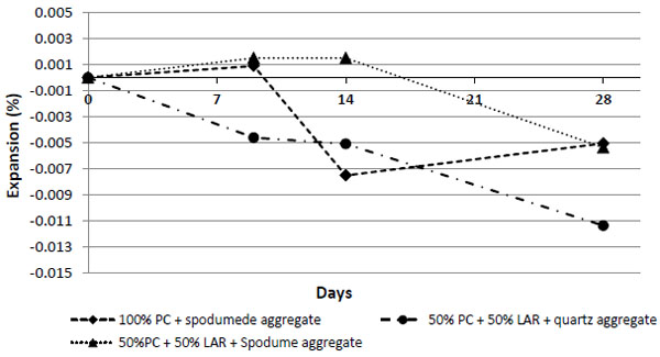 Fig. (9) shows the linear expansion of prims made with PC and LAR, in combination with natural (quartz) aggregate and spodumede aggregate. Three samples of each formulation were tested and the results of expansion are expressed in terms of the mean. The standard variation was calculated but not plotted in Fig. (9) to maintain neatness. The highest standard variation was 0.005% in all cases. The three formulations studied did not present any significant expansion up to 28 days of accelerated testing. On the contrary, all formulations presented a slight shrinkage at 28 days. Those results confirm that the employment of LAR and even spodumene aggregates do not represent a risk for ASR, as a limit of 0.1% linear expansion at 28 days is still accepted so that prims are not susceptible to ASR.