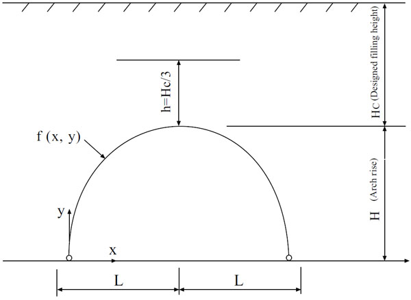 In the formula: λ-lateral earth pressure coefficient, λ= tan2(π/4-φ/2); φ-internal friction angle of earth; please refer to Fig. (3) for other parameters. As the catenary arch curve is a polynomial binary equation, analytical solution can’t be obtained directly, and the variable y needs to be obtained indirectly through progressive increase of variable x. The arch curve is then fitted indirectly. The internal force on arch piece can be obtained through finite element analysis (FEA), whose result conforms to actual stress state of culvert.