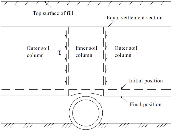 The vertical earth pressure borne by culvert depends on relative settlement difference of inner soil column and outer soil column of culvert top plane [5, 6]. As for positive buried culvert, with the load effect of upper part of backfill, because the rigidity of reinforced concrete culvert is far more than that of lateral soil of culvert, the settlement of outer soil column is more than that of inner soil column, thus the downward shear stress produced by outer soil column acts on inner soil column, making the actual earth pressure of culvert top be more than pressure of soil column, as shown in Fig. (4).