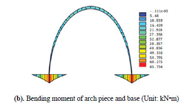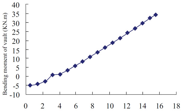 When the height of filling of culvert top is 10 m, the internal forces of arch and base are shown in Fig. (6). It can be seen from the figure that, arch pieces mainly suffer from stress, with only a very small action of bending moment and shear force. The bending moment borne at the vault is the largest and the vault is designed control section, and maximum internal force and position of arch piece are shown in Table 2. Fig. (7) is the diagram of relationship between bending moment of vault and height of backfill; when the height of filled earth is less than 3 m, the bending moment of vault is a negative value, which shows that when the filling is lower, the hogging moment of earth lateral pressure generated on the vault is greater than the sagging moment generated by the vertical earth pressure; when the height of filled earth is 3 m, it is the critical height that hogging moment converts to sagging moment; when the height of filled earth is more than 3 m, the bending moment of vault turns into a positive value, And it increases with the height of filling. Therefore, according to the catenary arch curve for the designed height of filled earth, it is applicable when the height of filled earth is lower than the designed height of filled earth, but is higher than the critical height.
