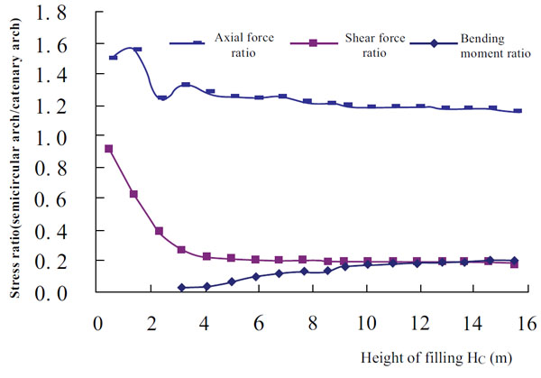 Relationship between internal force ratio of semicircular arch and catenary arch and height of filling.