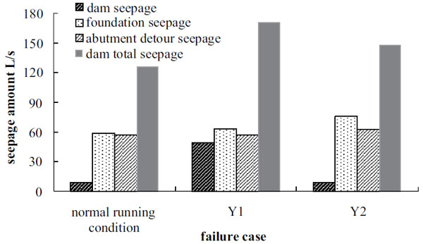 As can be seen in Fig. (10), when local face damage occurs during normal operation, the seepage rate changes everywhere. Seepage occurs mainly in the dam foundation at 59.2 L/s. The seepage rate is 9.44 L/s in the dam body, and total seepage is 125.98 L/s. If there is crushing failure of a local vertical joint in the middle face of river bed (Y1), the seepage from dam foundation and abutment by-pass and of both banks remains unchanged. Seepage from the dam increases greatly, however, to 49.83 L/s. Tearing damage to the joint between the toe slabs of both banks and face (Y2), cause no seepage from the dam, but that from both the dam foundation and abutments increases. Dam foundation seepage increases to 76.64 L/s.