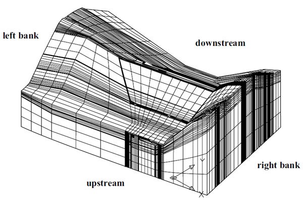 Because of its structural features and filling requirements, this CFRD study needs meshing generation during meshing encryption around the seepage control measures, with larger variation of seepage factors, then carrying out simple generation in rock-filling body of the dam which is always waterless or with limited variation of seepage factors. This enables development of a three-dimensional, finite element computational grid of the seepage field with proper density and high quality as shown in Fig. (3). The model consists mainly of isoparametric elements with eight hexahedron nodes, comprising 100,192 elements and 106,847 nodes in all as shown in Fig. (4).