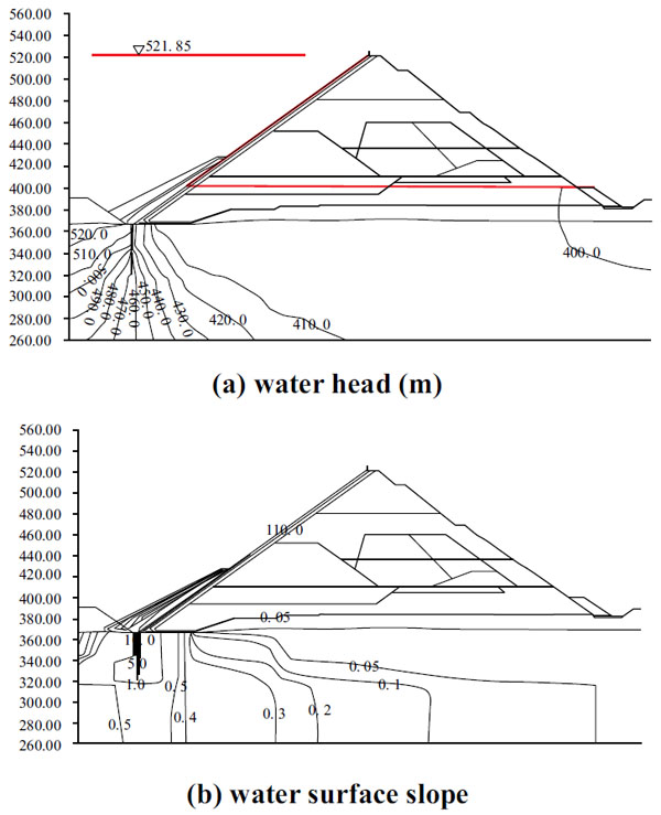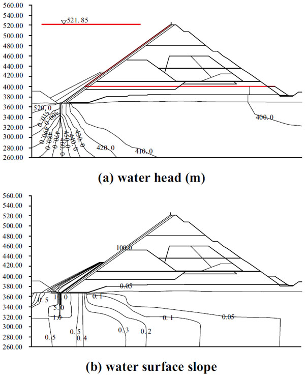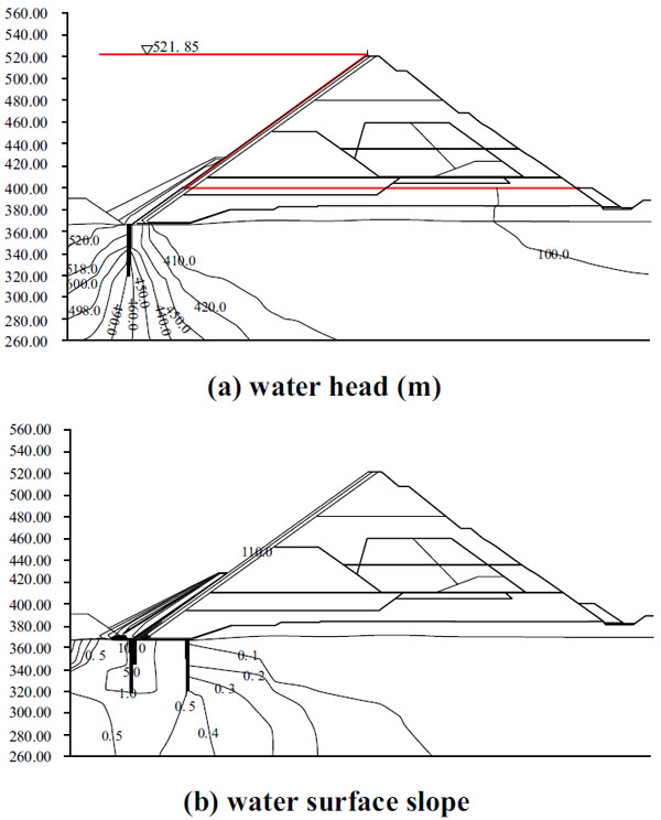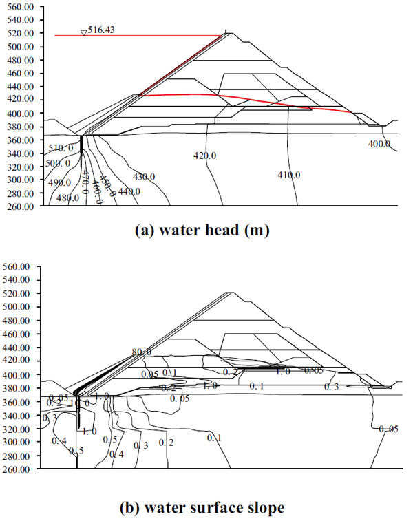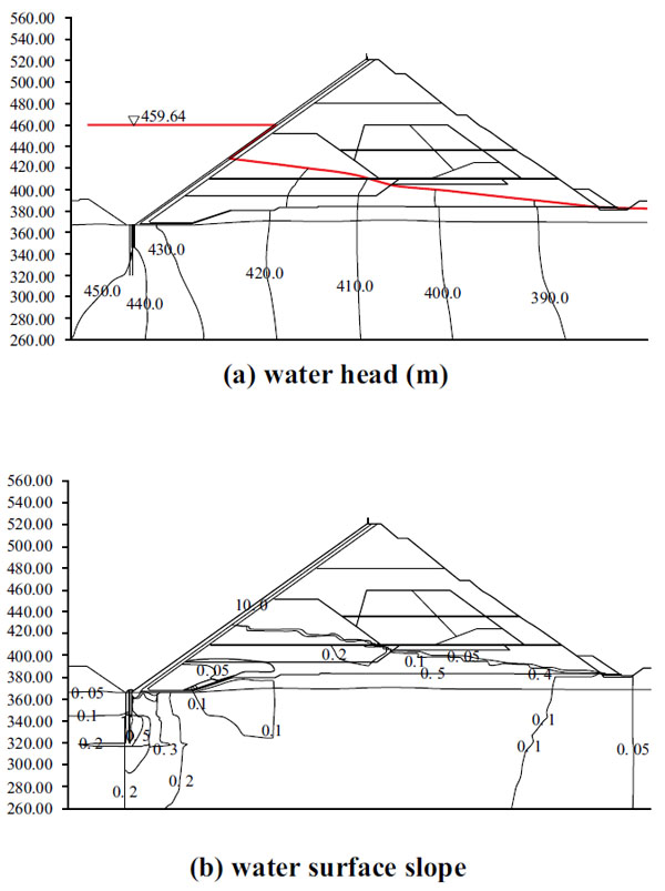 The basic isoline distribution law of water head in normal operation is that the head distribution law is reasonable across the whole seepage field, starting from normal water stage upstream against the concrete face, whose free surface sharply decreases and becomes horizontal in the rock-filling zone, and this seepage control system plays an effective part in anti-seepage.
