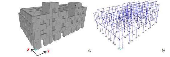 3D view of the structural model (BT”A”): (a) solid scheme; (b) unifilar scheme.