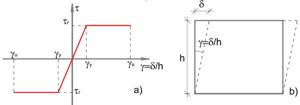 Shear plastic hinges definition: (a) stress-strain law; (b) angular sliding of a generic panel.