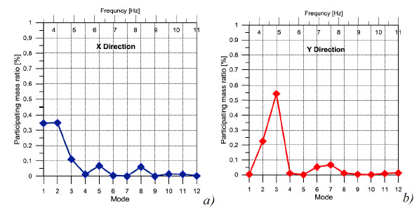 The modal analysis of the numerical model identified, revealed a significant irregularity in structural response especially for direction X, where the participating mass was distributed on the first two modes at frequencies between 3.5 and 4.10 Hz. In direction Y the third mode had a mass concentration of 55% at the frequency of 5 Hz. The distribution of the participating masses in the first 12 modes in X and Y directions is graphically represented in Fig. (14).