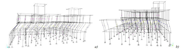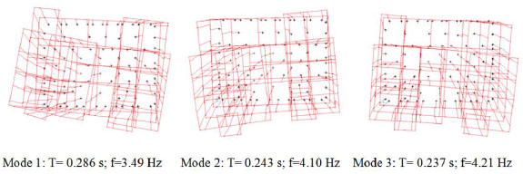 The modal shapes associated to the first 3 modes are shown in Fig. (15). In both the 3 modes a significant torsional component can be recognized. The reason can be found observing the variation of the plan conformation from one floor to the upper one, cause of an irregular distribution of masses and stiffness.