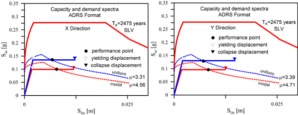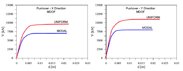 Pushover analysis was carried out in order to define the capacity of the structures especially in terms of early damage and collapse ground accelerations. Given the strategic role of the buildings the elastic response spectrum was defined (according to Italian Code), considering return period of TR=2475 years, a spectral amplification factor Fo=3.09 and stratigraphic amplification coefficient S=1.2. In order to consider the uncertainties on the actual response beyond the elastic limit, as well as also suggested by the codes, the pushover analysis was repeated with two force profiles for each direction. A modal distribution and a uniform distribution of lateral loads were considered. Given that the shear hinges introduced were not sensitive to the axial load variation, the profiles were assigned with a single sign for each direction considered. The base shear (V) - roof displacement (d) responses obtained by the 4 analyses are shown in Fig. (16) for the multi degree of freedom system (MDOF).
