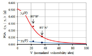 Pushover analyses allowed to determine the reference critical accelerations for the prototype buildings BT”A” and BT”B”. In particular, reference was made to minimum values respectively for accelerations of early damage and collapse. PGA values are reported in Table 5 together with the values of the respective normalized vulnerability indexes of the buildings.