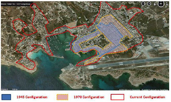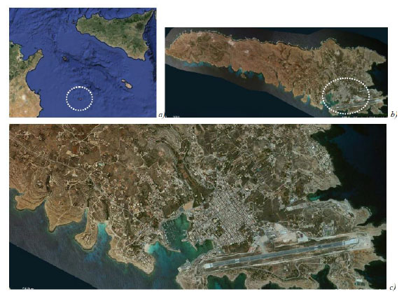 The study of the urban evolution represents an important basis for the all the operations aimed at the recognition of building typologies and constructive technologies. It allows to localize within the timeline the historical events, facts, laws and technical prescriptions influencing the constructive practice trends of specific epochs. Lampedusa is a small island situated in the middle of Mediterranean sea (Fig. 2a, b). The evolution of the urban settlement of Lampedusa is concentrated in port area, the seat of trade, tourism and fishing activities (Fig. 2c).