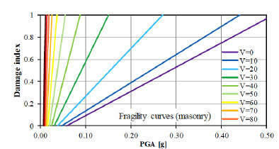 Consequently, the fragility functions for masonry buildings of the city centre of Lampedusa are univocally identified for the different vulnerability indexes (Fig. 20). The latter, once known the vulnerability index of a building, allow to determine the level of damage that this will undergo as function of the severity of the earthquake, identified by the peak ground acceleration. This tool is particularly useful for Civil Protection purposes, since it allows to make damage estimations on buildings for given scenarios of seismic intensity as described in the subsequent section.