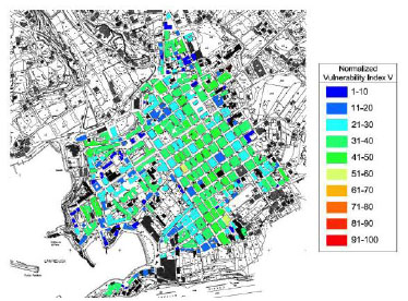 The final output is reported in 3 maps. The first one (Fig. 21) is the map of the vulnerability index, obtained by the application of the GNDT procedure to the masonry buildings investigated, which represent almost the totality within the urban centre.
