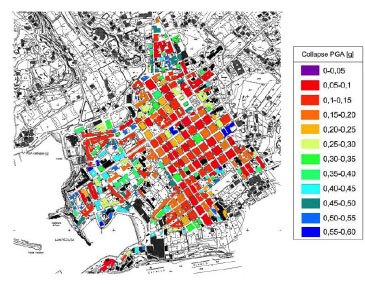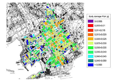The early damage and collapse PGA values are instead rather low. However, considering the expected PGA values, which are associated the low seismicity of the area, one can exclude, withgood approximation, the possibilityof the occurrence ofcatastrophic post-earthquakescenarios. It appears evident from the maps as the areas characterized by a greater vulnerability refer to the oldest urban disposition, that was also the most subject to further transformations during the time. The peripheral areas, consisting of newer buildings, resulted instead less vulnerable, consistently with the expectations coming from the initial assessments.
