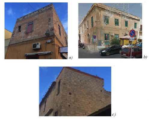 An accurate preliminary analysis of the building typologies in the urban settlement has been also carried out in order to select the most suitable tools for the assessment of the seismic vulnerability at large scale. This allows getting a framework for the classification of buildings, necessary to facilitate the operations of survey and collection of information. The opportunity to take advantage of a preliminary study aimed to associate building typologies and details to certain historical periods, greatly simplified the procedure and allowed a smaller margin of error. From an early examination on the structural types, it resulted that over 85% of the buildings in the area of the city centre had masonry primary structure. The remaining 15% were reinforced concrete buildings or in a few cases had mixed primary structure. The large prevalence of masonry buildings was due primarily to the availability of natural resources on the island which had a rich geological formation of limestone rock in the subsoil. The primary material came directly from the quarries for many years and up to 1970, when two factories for the production of concrete blocks were opened with a consequent change of trend in the choice of the basic building material. Some pictures of typical calcarenite and calcarenite block masonry buildings are reported in Fig. (4).