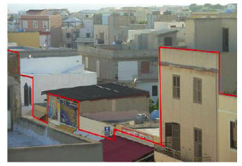 The quality of the construction and resistant systems was subject to a careful analysis aimed at the characterization of some technological aspects really influent for the recognition of vulnerability. As first it was observed that the majority of the buildings did not exceed two floors above the ground. The walls were typically compact with an adequate thickness. These two elements allowed presuming that in general the stress rate of materials is quite low and the primary structures are generally under safety conditions at least with respect to gravity loads. The reduced height of the buildings also limits the extent of the possible seismic involvement of structures. The primary structural elements, despite a regular degradation due to the aging, presented construction details of good workmanship. The floors were made of RC slabs (or mixed RC-clay block) granting a rigid behavior. It was also recognized that both limestone and concrete block masonries were featured by RC curbs at each level (Fig. 4a, c) and the orthogonal walls resulted effectively clamped at the corners, ensuring a box-like behavior of the structure (Fig. 4a, c). Finally, the walls did not typically exhibit signs of structural instability. On the other hand in most of the cases, the buildings had the configuration of aggregates. The overall configuration presented substantial height differences of the structural bodies, causing lateral stiffness and strength variations from one floor to the upper one Fig. (5). Such an irregular condition over the height was recognized as the primary and most relevant element of vulnerability for the buildings belonging to the urban area.