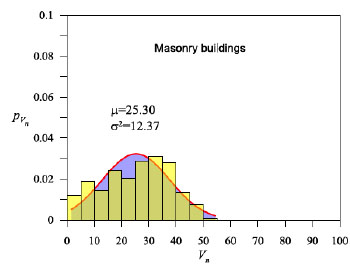 Regarding to masonry buildings a statistical output is observable in Fig. (7), where the probabilistic distribution of the normalized vulnerability index recognized is represented. It appears clear that the vulnerability was settled to low-mid levels. The average normalized vulnerability index was 25.30 while the maximum did not exceed 50. The recorded distribution showed however a wide variance.