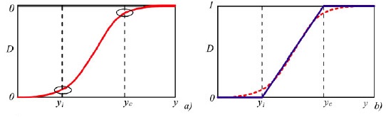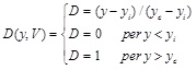The definition of a relationship between the severity of the earthquake and the damage, through the vulnerability index V, is based on the observation that a building, subject to seismic actions of increasing severity is typically characterized by a beginning stage of damaging, a phase of increase and a rapid decay up to the collapse. If one assumes the parameter y=a/g, which identifies the normalized ground acceleration, as index of the severity and the parameter D as index of the damage (between 0 and 1), identifying the loss of the economic value, the relationship may be represented by a fragility function Fig. (8).