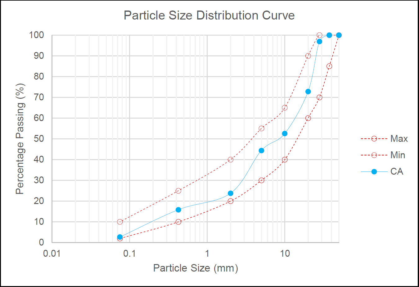 The CA was sourced from Kajang Rock Quarry, Selangor, Malaysia. Gradation was controlled to comply with the Public Works Department (PWD) Malaysia specifications for pavement applications. The material was sieved to meet the required size distribution, as detailed in Table 1. The corresponding particle size distribution curve is shown in Fig. (1).