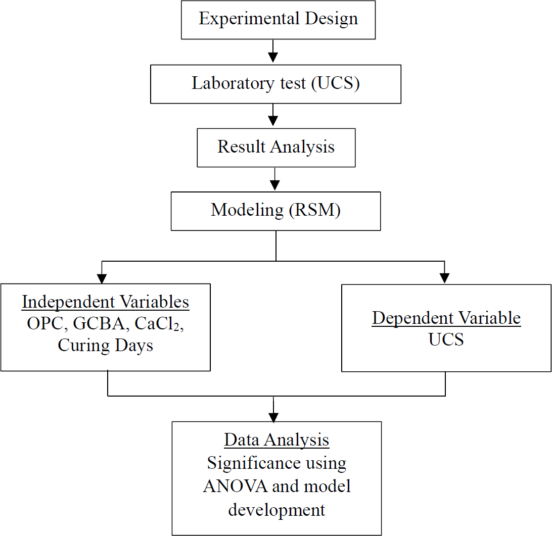 The study framework consists of three main phases: unconfined compressive strength (UCS) testing, data modeling using RSM, and statistical validation. The relationship between the independent variables (OPC, GCBA, CaCl2 content, and curing time) and the response variable (UCS) was analyzed to develop predictive models. The overall experimental process, including design, testing, and modeling, is summarized in Fig. (2).
