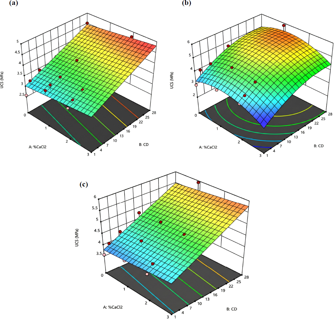 The 3D response surface models further illustrated these patterns, showing steady UCS increases with CaCl2 addition, particularly in 4% OPC mixtures. This suggests that higher OPC content enhances hydration kinetics and supports the formation of dense calcium silicate hydrate (C-S-H) networks. However, when CaCl2 dosage exceeded 2%, UCS declined across all mix types, highlighting the need to balance early strength acceleration with long-term microstructural stability.
