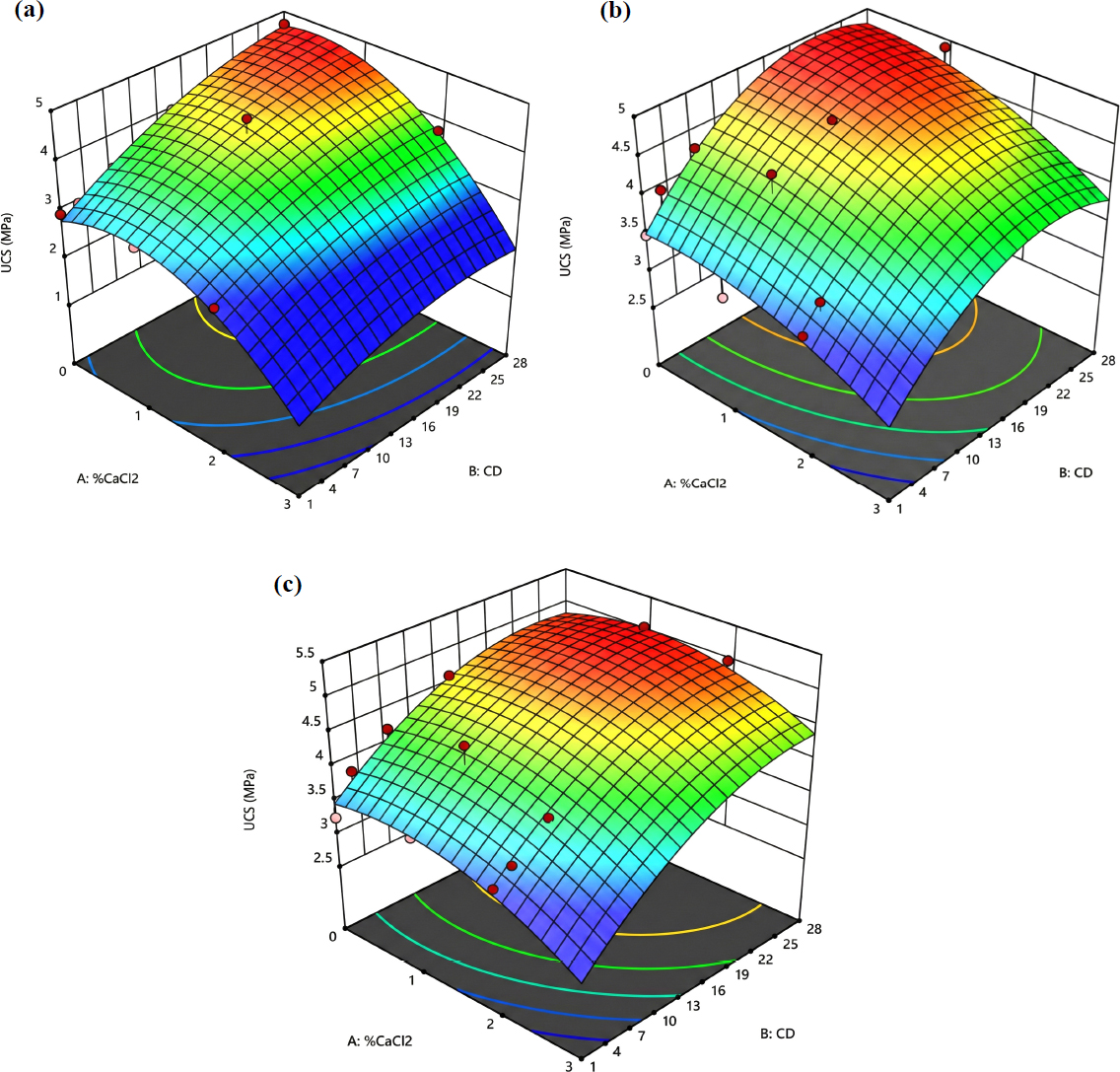 2. CaCl2 enhanced early-age UCS, especially within the first 7 curing days. However, dosages above 2% reduced strength, likely due to rapid setting, internal stress buildup, and microcracking.